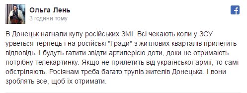 "...Когда Буратино кинул в ямку на Поле Чудес пять золотых, то в то, что вырастет дерево с монетами на ветках, верил только он один. А когда в Стране Дураков рассказывают, будто на Донбассе боеприпасы, танки и орудия сами собой появляются из ниоткуда, то в это должны верить все 140 миллионов дураков...